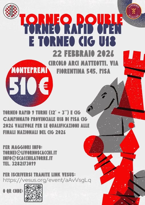 Domenica 22 Febbraio a Pisa, presso la sala del Circolo ARCI La Pagoda in via Fiorentina 545, vi aspettiamo per Torneo Double: Rapid(a fasce) + Campionato Italiano Giovanile organizzato insieme a Livorno Scacchi. Ulteriori informazioni sul bando ufficiale. Preiscrizioni e bando su Vesus.